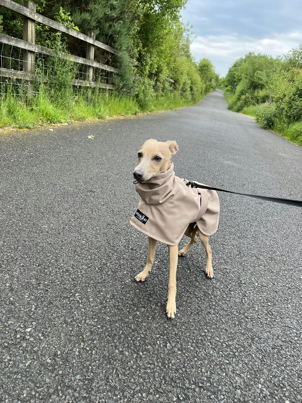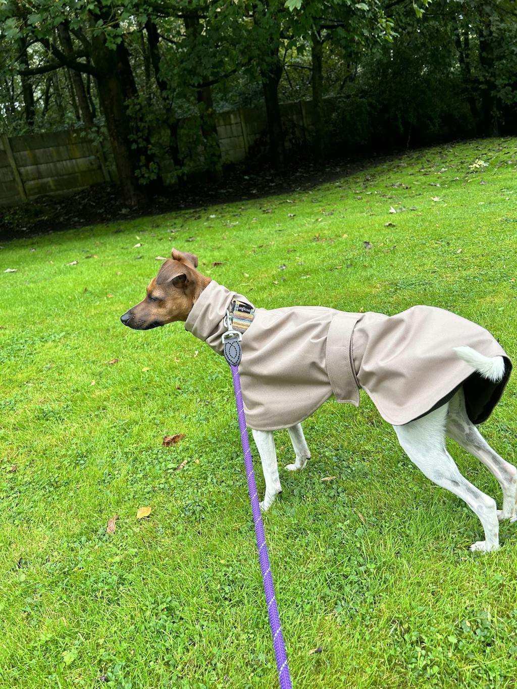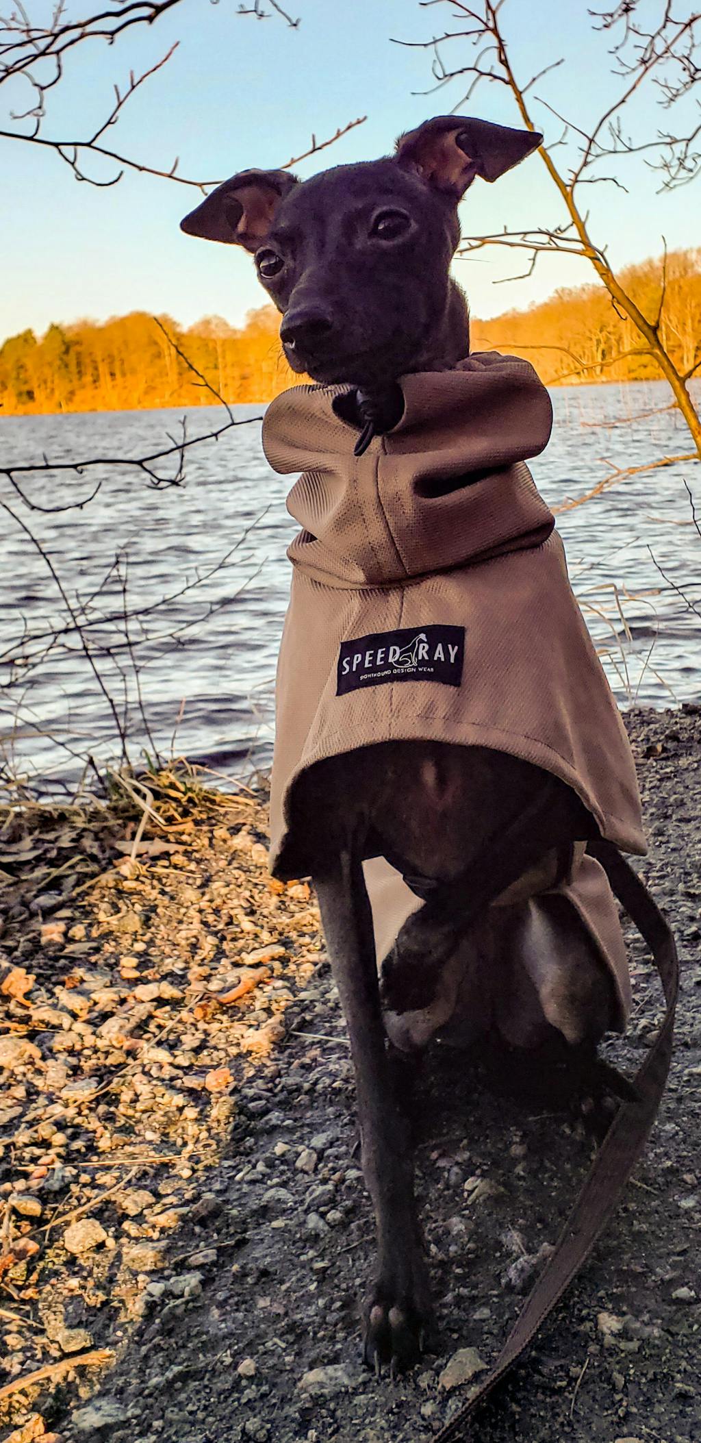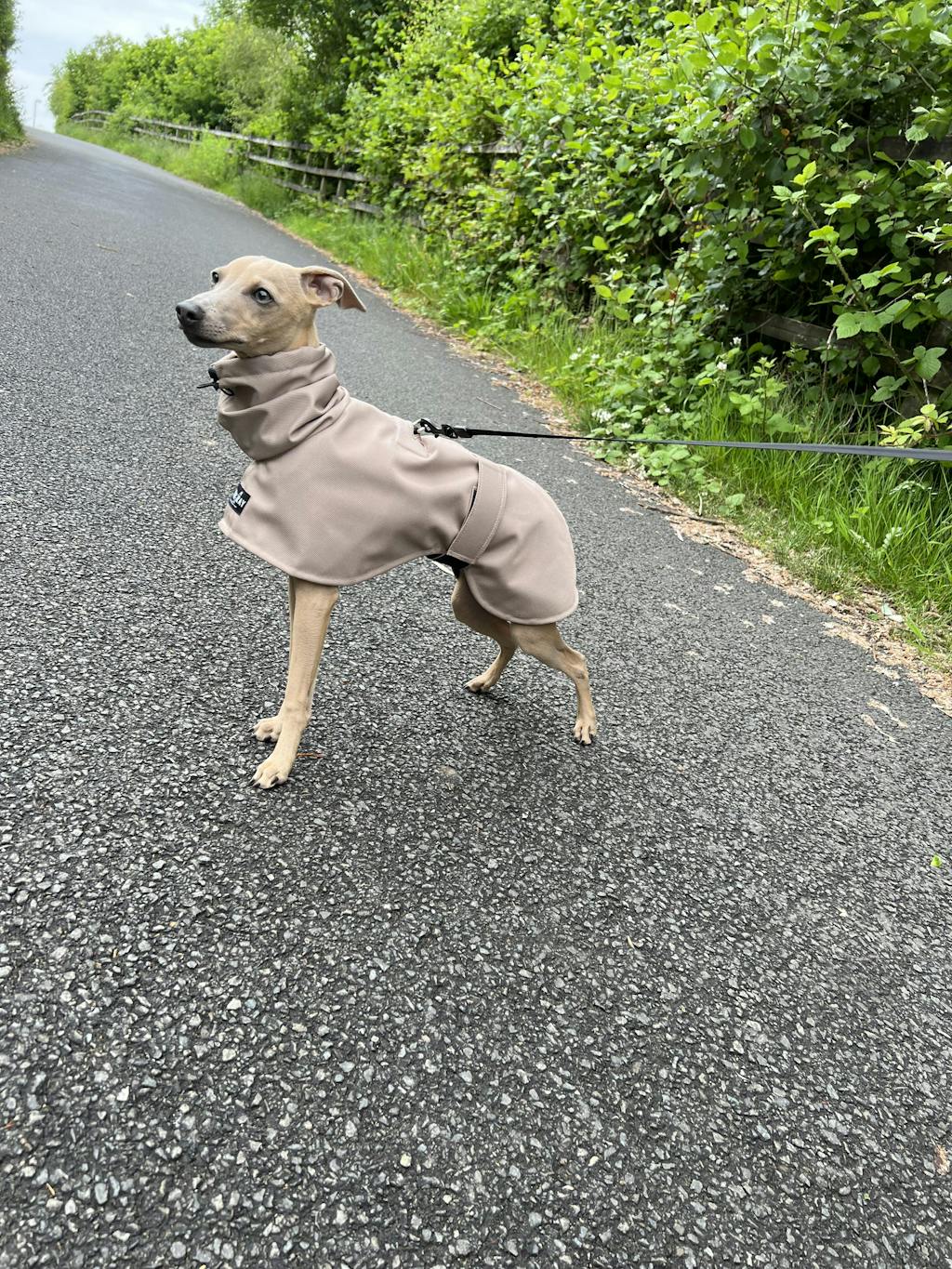 The additional protective layer of our coat keeping your Italian Greyhound dry, even when in full zoom mode, is what makes the experience so much more enjoyable during those rainy days. The neck drawstring feature keeps the coat secure, acting as a hood to protect the ears on those very wet walks. This feature also helps prevent the coat from blowing around, along with its velcro fitted belt for ease of adjustability, during windy walks and an extreme burst of energy (Zoomies!).