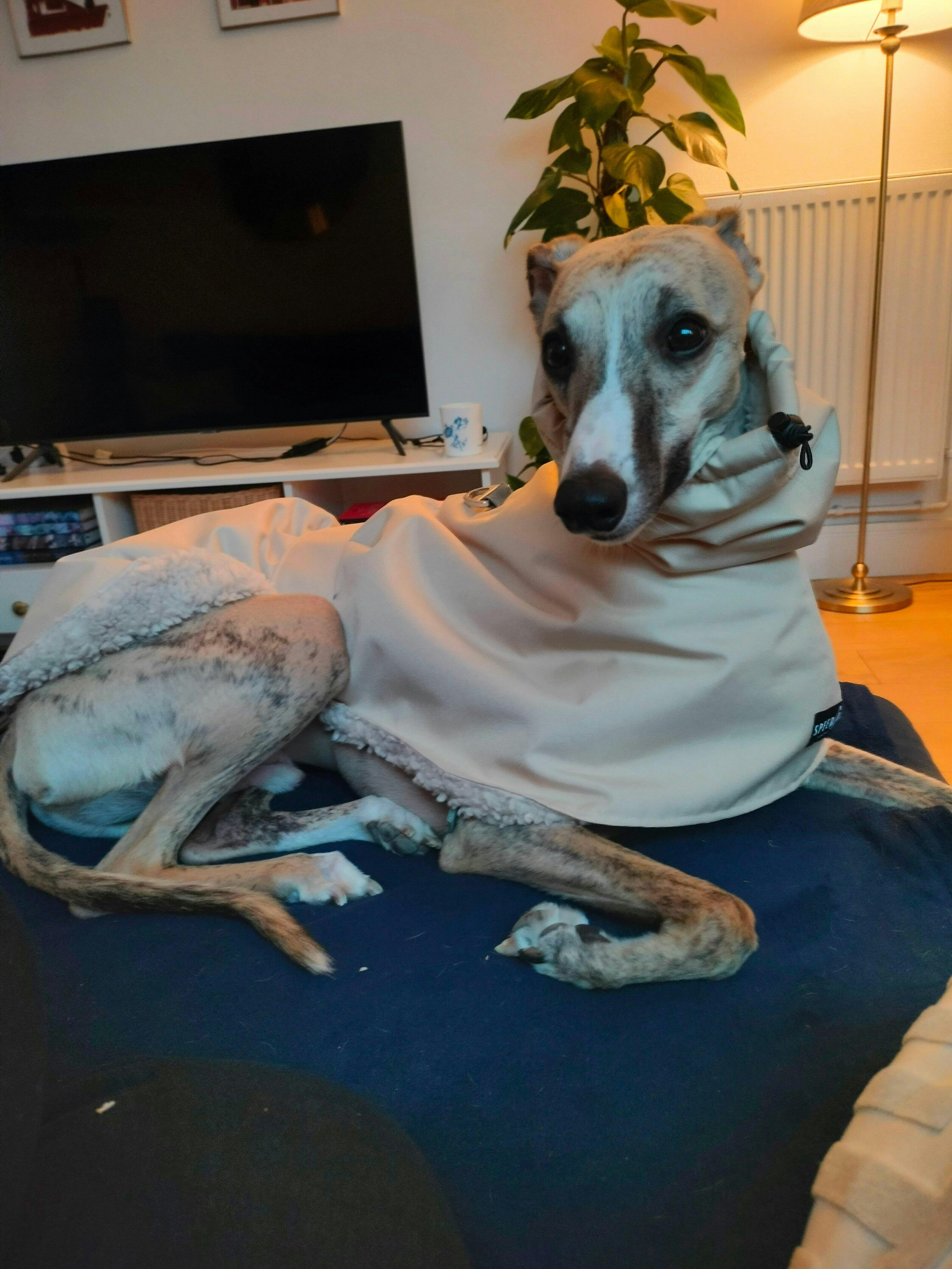 The Whippet garment is easily folded away either into a small bag. It's always best to be prepared on a walk. They'll thank you on the dry journey home.